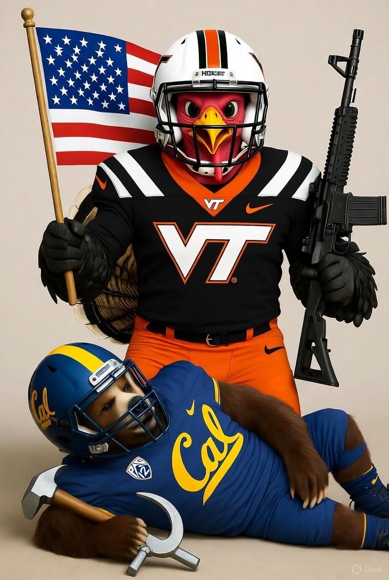 Anyway, I’m sure you’re familiar with the phenomenon known as Calgorithm from last year's college football season. Well, those accounts still exist and post incredible content. With Cal heading to Blacksburg on Friday, a Virginia Tech account @vt_isyourdaddy posted an AI photo (below) of a Hokie saying, “we must defeat communism”. The Calgorithm then promptly flamed this guy into oblivion by calling how horrible the AI photo was, and how he’s not a true patriot for not having a bumpstock on his AR-15. Two posts and two days before this, the same Hokie account posted a selfie with his now-fiancée after they got engaged. Below are some of the replies from the Calgorithm: